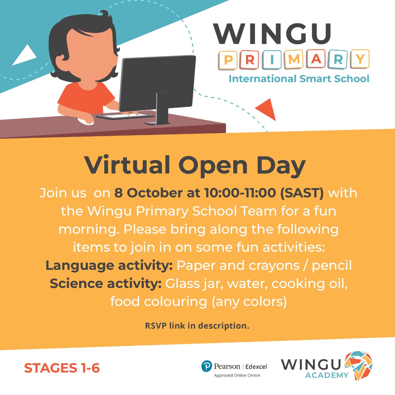 Calling all parents! Are you looking for a world-class primary online school offering the British International curriculum by Pearson Edexcel? Or perhaps it will be your first time sending your child to school? Wingu Academy, SA's top-rated online school, will not only prep your child for the future with our international curriculum, but we'll have some engaging adventures in the process too. So, don't miss our online Primary School Open Day on 8 October from 10:00 - 11:00 (SAST). Don't forget to come prepared - check out the More Info button for more details!