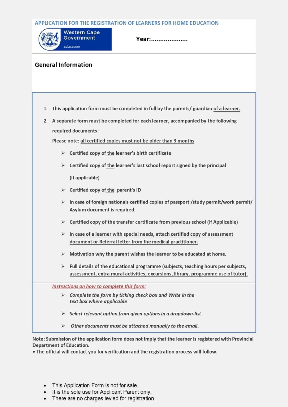 To apply, you will first need to download the application form for your province, supply the required documents (these will be listed usually on the first page of the application form, as seen in the sample above). These can be downloaded for your province from the DBE Home Education page, which we have linked below.